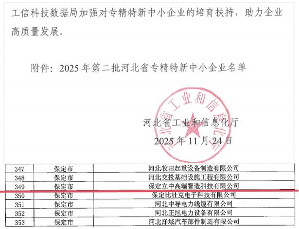 保定立中高端智造科技有限公司通過河北省專精特新中小企業(yè)認(rèn)定
